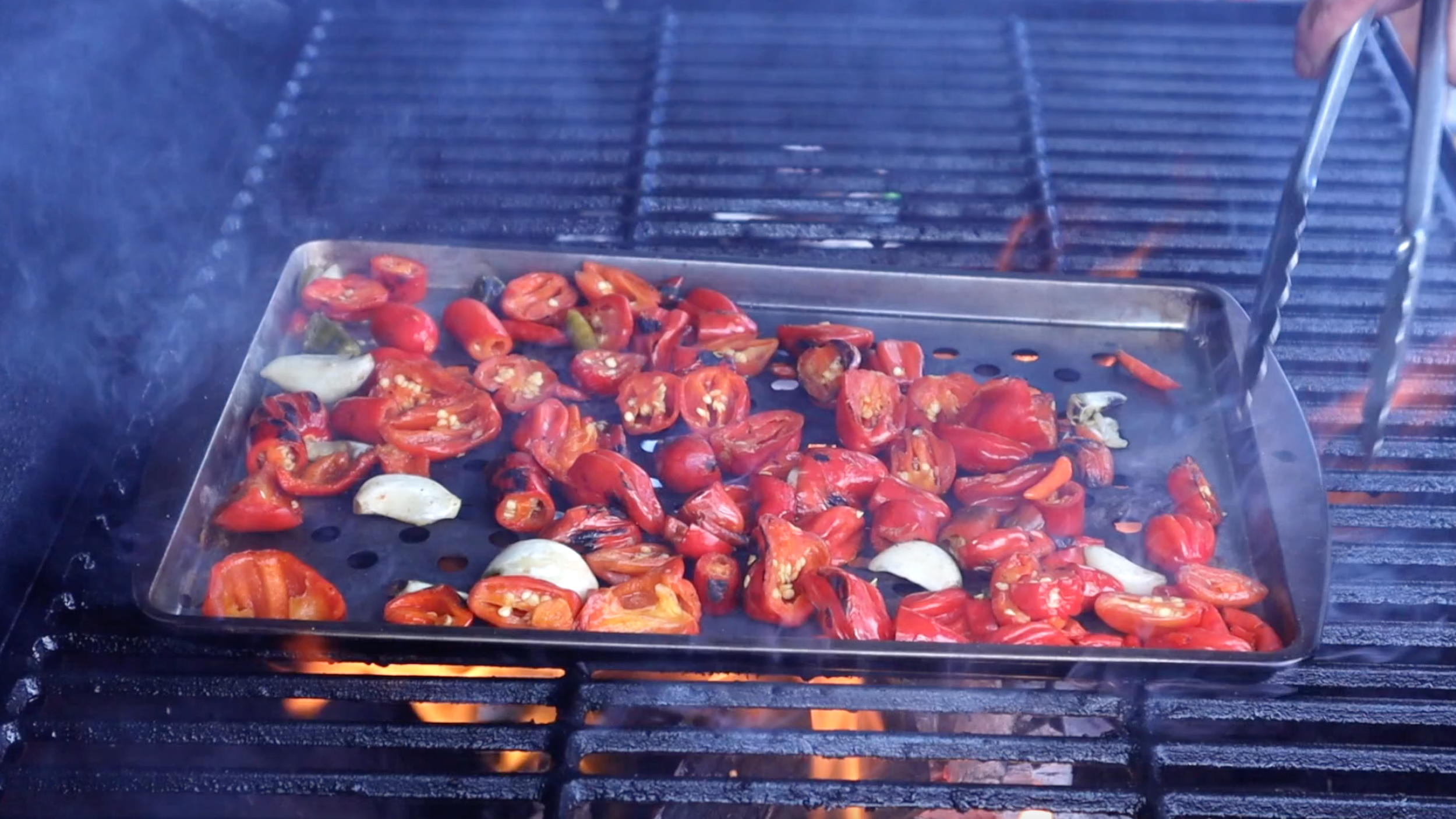 When the fermentation period is done, check the pH of the brine. It should be around 3.5-3.7 pH if the fermentation was succesful. Strain the ingredients reserving the brine for blending later on. Place the peppers and garlic on the perforated pan. Fire up the charcoal grill with lump charcoal or briquettes. Once the charcoal is warmed up and ashed over, place a split of wood on the charcoal and let it burn until the flames are burning clean. When ready, place the pan with the ingredients directly over the flames so that the flames kiss the peppers and garlic. The flames will char and color the ingredients. When everything is evenly charred, move the pan over to indirect heat and close the lid to the grill and let cook for about 10 minutes to soften them.