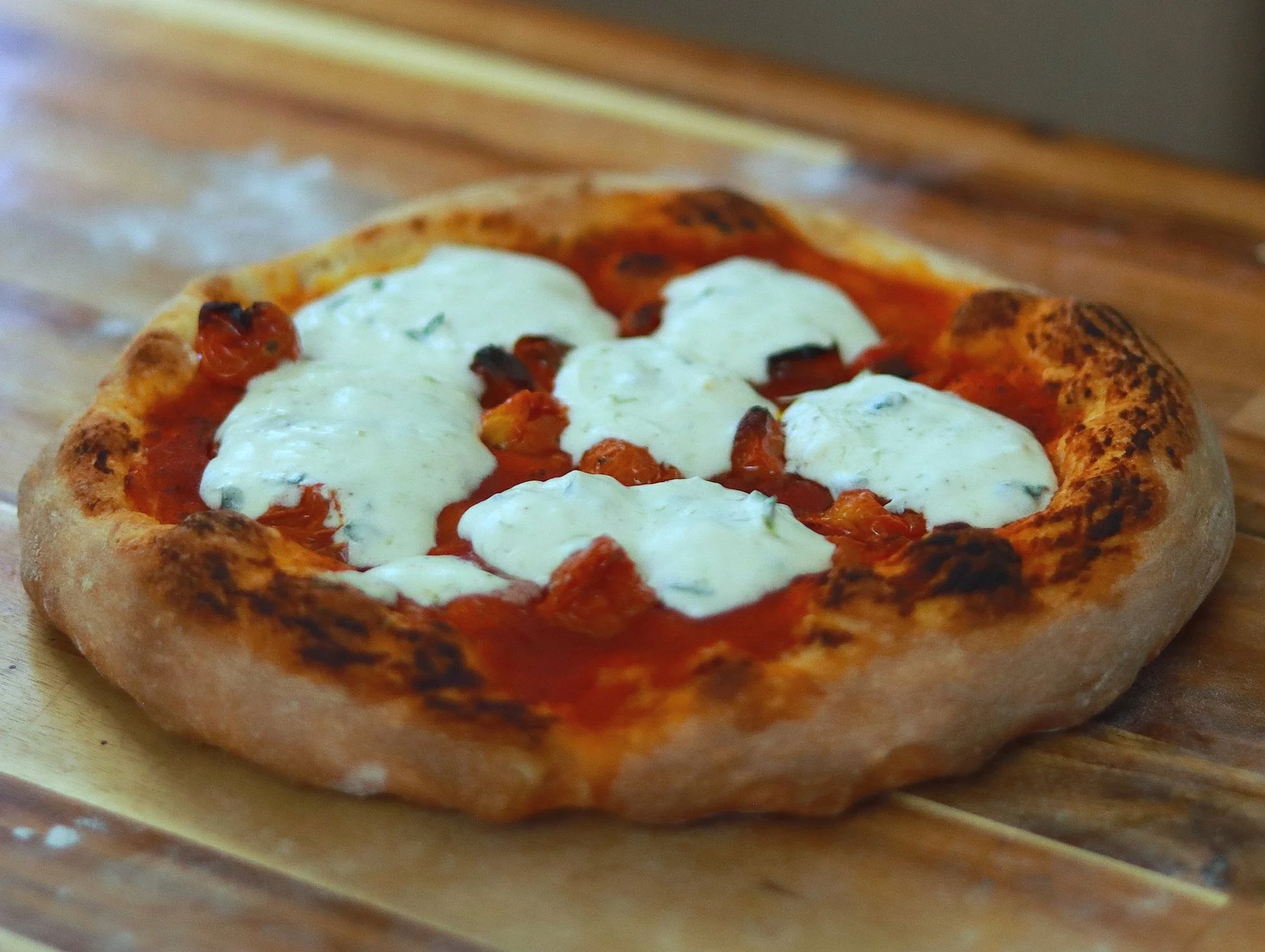 I made some oven baked grape tomatoes that were delicious when placed on a thin layer of tomato sauce. Then, I made a whipped goat cheese as the cheese for the pizza that paired perfectly with the tomatoes. It adds a nice zesty finish to the pizza and helps mellow out the acidity of the tomato sauce. Below is a quick run down.