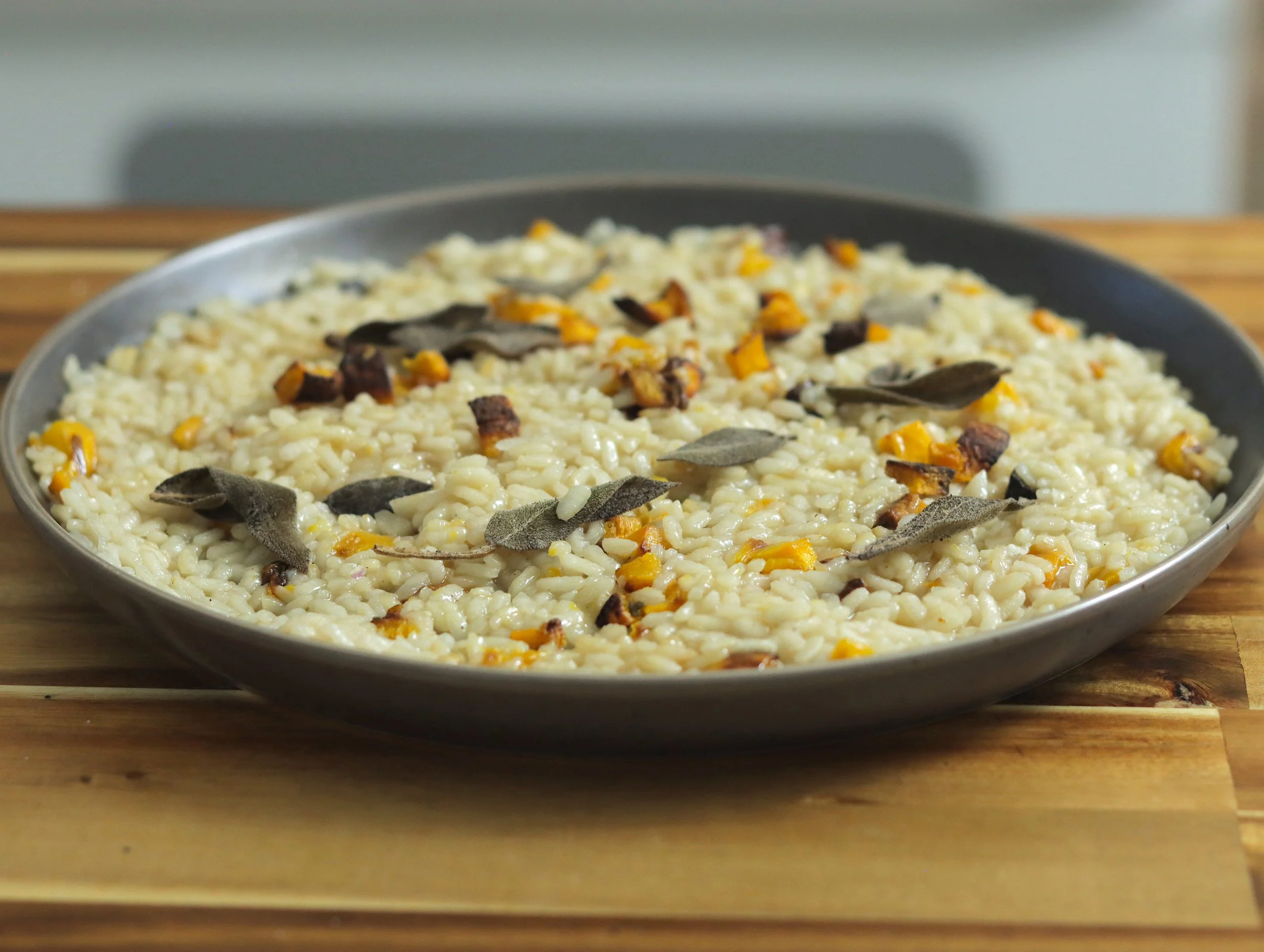 Add more stock if needed. Risotto is to be not too thick and won’t hold its shape when spooned into a pile on a plate. Once the rice is cooked, gently fold in the squash, adding more stock if needed.