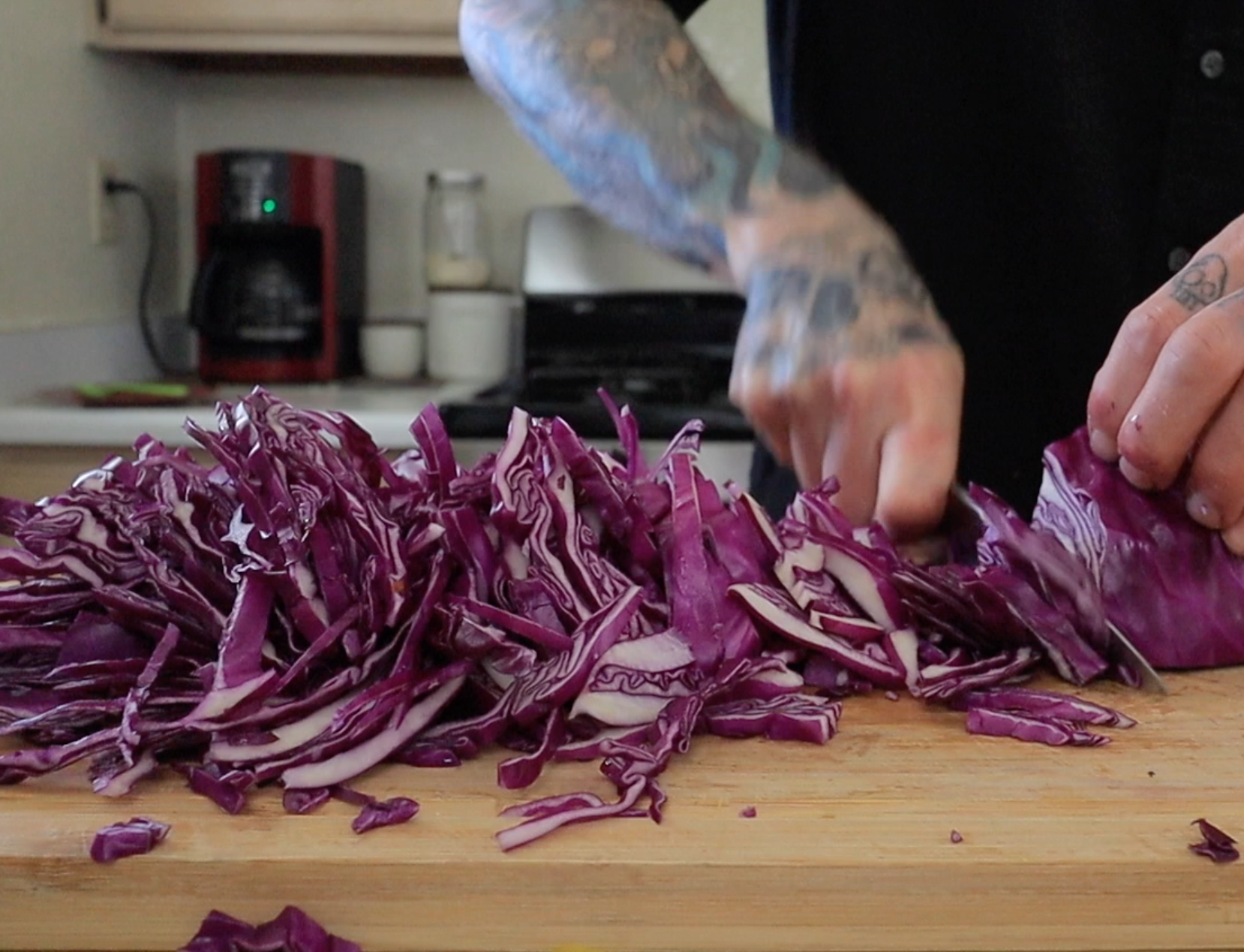 In my example from the video I made, the shredded cabbage and beet weighed 928 grams. So, 928 x .002 = 18.56 g. This is the amount of salt needed. If your scale doesn’t read decimal points, round to the nearest whole number. The salt amount difference is minimal if rounded up or down.