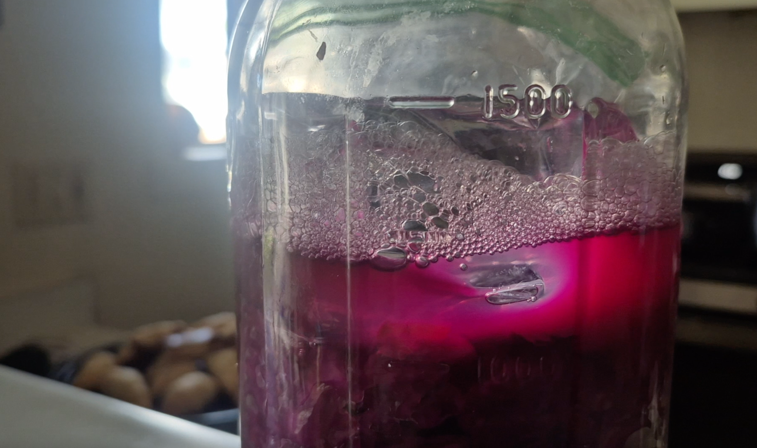 Allow to ferment on the counter or pantry away from direct sunlight. Make sure that if you put a lid on the jar that has no airlock, keep it loosely screwed on so gas doesn't build up and possibly cause the jar to burst. The best temperature range for fermentation is around 68-75 degrees F. The fermentation period is between 7 days to 3 weeks which can be adjusted according to personal taste. I like the texture of the sauerkraut when fermented for around a week to a week and a half. On day 3 or 4, you should notices signs of fermentation. This will look like tiny bubbles starting to form and collect on the surface of the cabbage. This is a by product of the lactic acid bacteria consuming the natural sugars in the cabbage and beet.