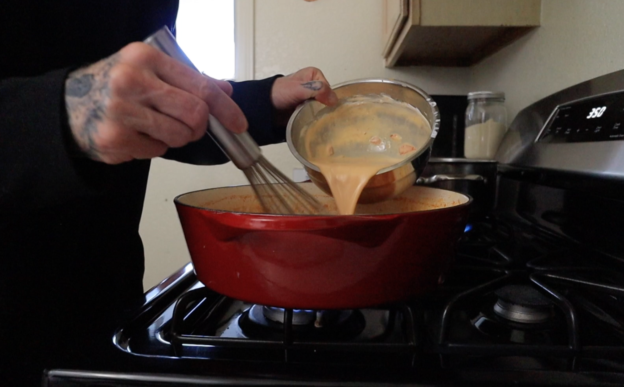 Reduce the heat on the pan to medium low and add the diced onion. Once the onion piecess hit the pan, season them with a pinch of salt. The salt will help bring out the sweetness. Sweat for about 3 minutes to get them translucent and slightly caramelize. Add the cut up bell pepper and minced garlic. Cook the peppers with the onion for another 3 minutes before adding the tomatoes stirring frequently to avoid burning the garlic. Add the paprika with the tomatoes, stir frequently making sure to not burn the paprika and cook for about 1 minute. Make a well in the middle of the pan and melt in the butter. Add the flour and mix into the melted butter (roux) and cook for 2-3 minutes stirring frequently.