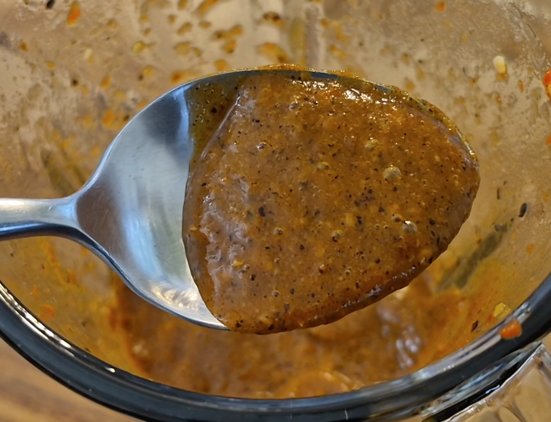 I like a smooth sauce, therefor I strain the sauce through a fine mesh strainer catching the sauce in a bowl.