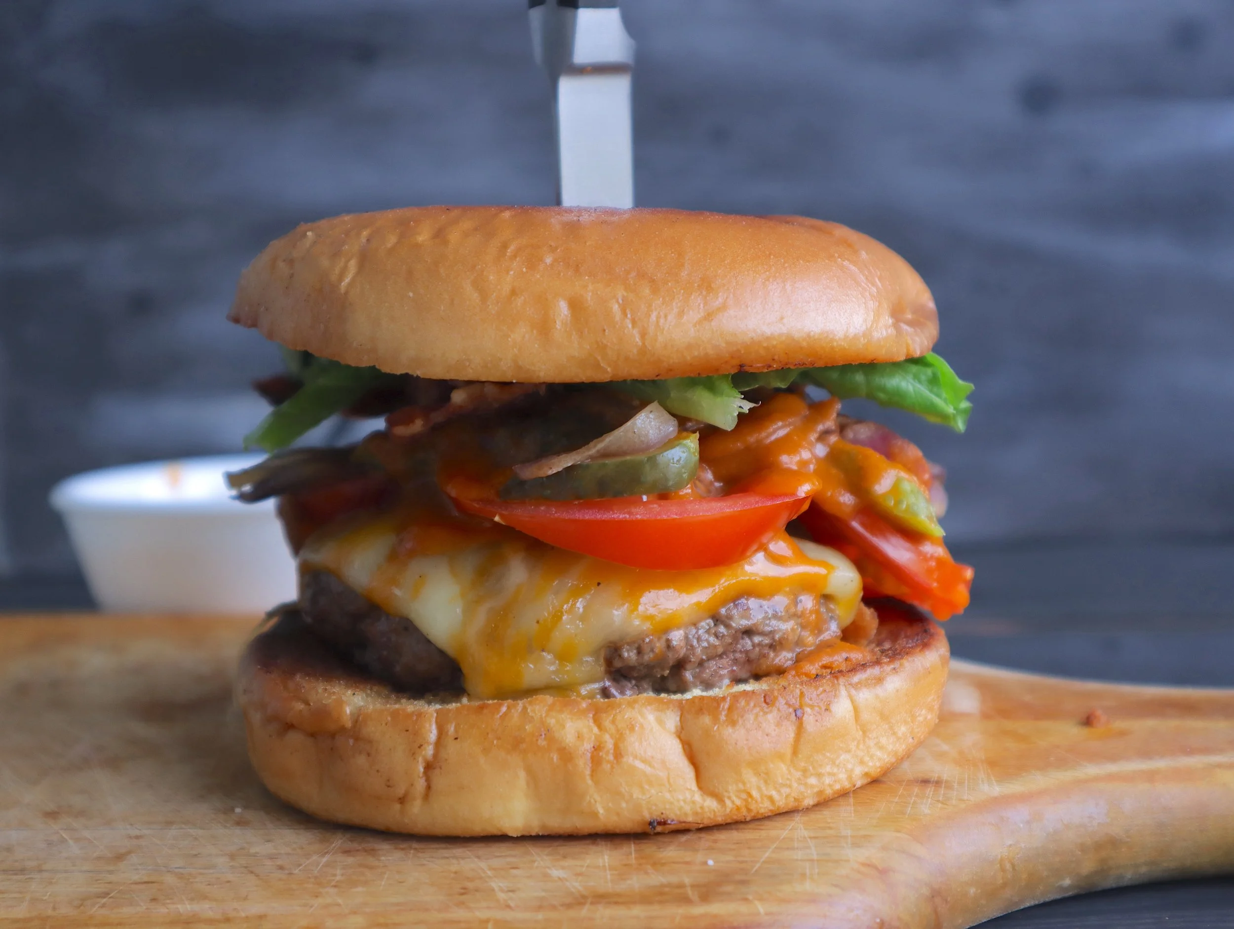 I love me a classic burger. No fancy extras, no crazy cooking techniques. Burger patty with cheese, some pickles, onions, tomatoes, some sort of condiment (I love me bbq sauce) and some crispy bacon….what’s not to love!