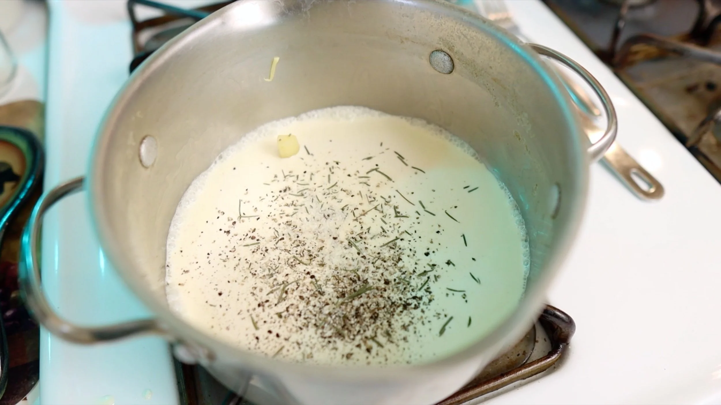 Place pot back on medium low heat while parsnips are draining in colander. Add 1/2 -3/4 c heavy cream (for desired thickness), 1 tbsp kosher salt, 1 tbsp, pinch dried rosemary and sage to the pot. Bring to a simmer and add cooked parsnips.
