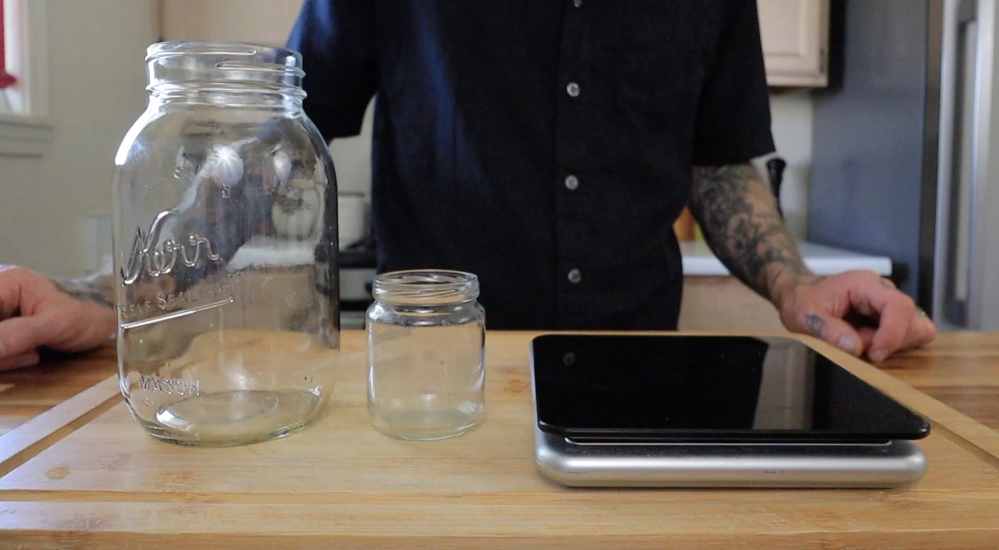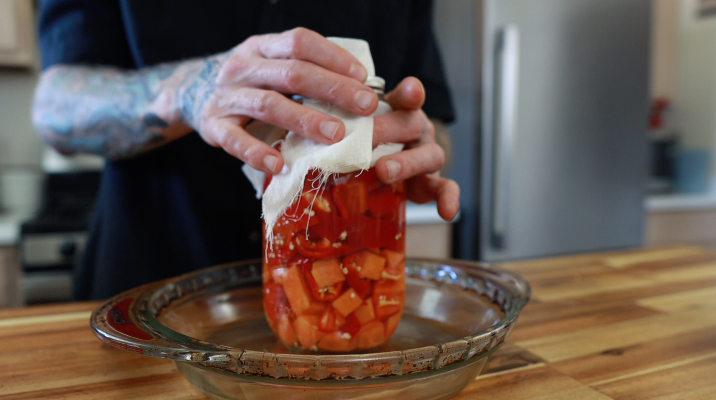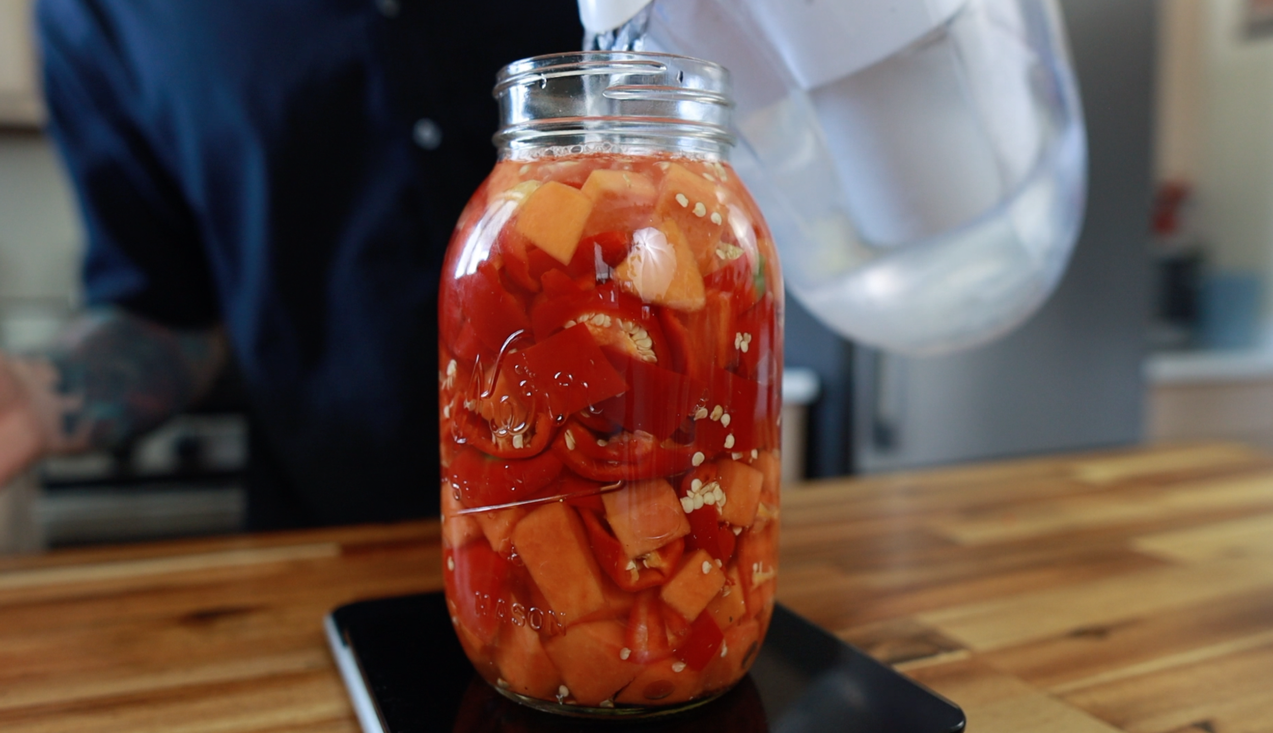 Place the jar on the scale set to grams. Tare (zero) the scale and add the chopped papaya and peppers. Fill the jar with filtered water just to the bottom of the neck of the jar. Now, record that weight and multiply it by 2.5 %.