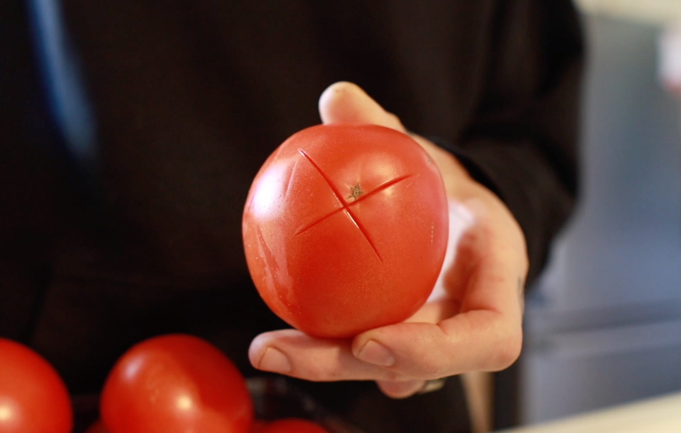 Scoring the flesh of the tomato helps the skin get easily removed after a quick blanch.